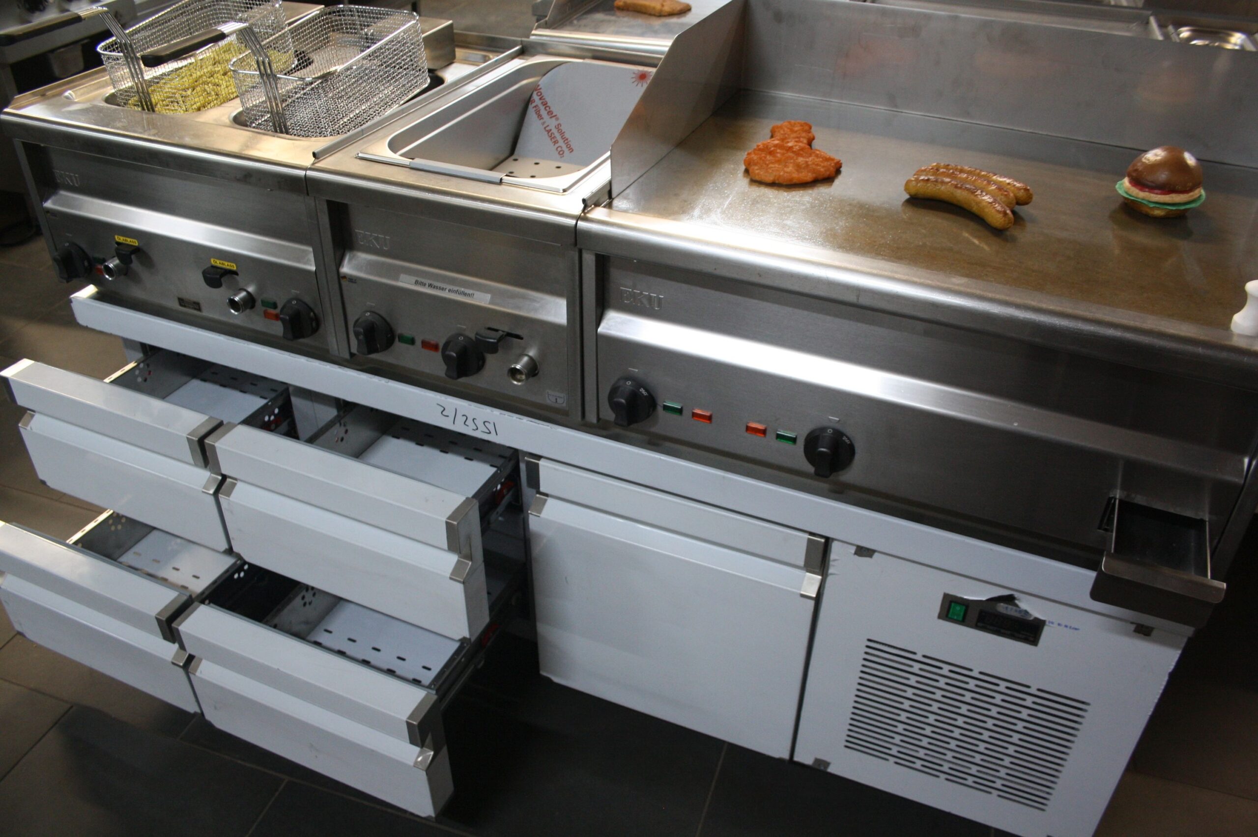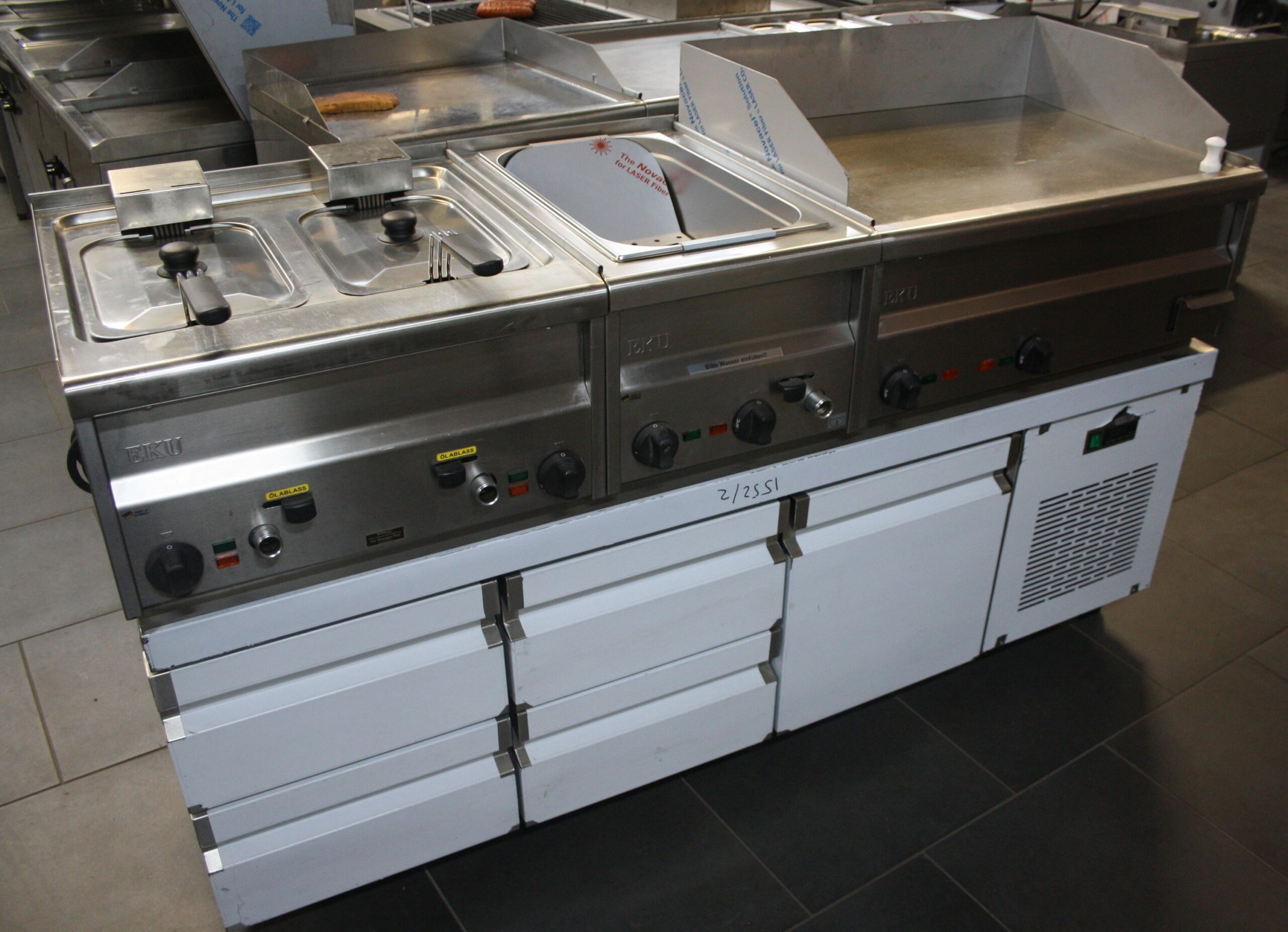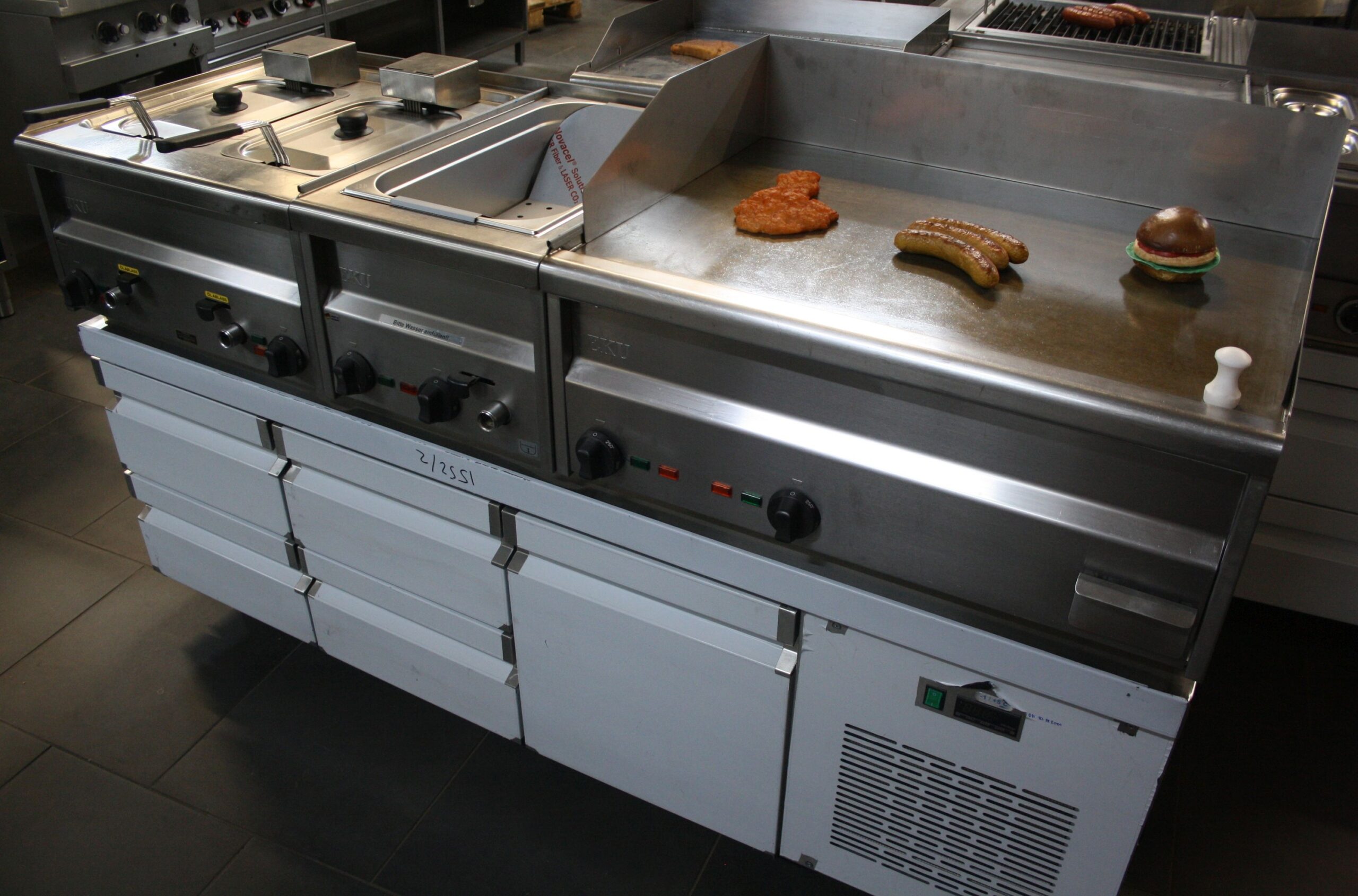 bestehend aus: Fritteuse, Bräter, Bain Marie oder Pommesbecken beheizt, Tischmodul gekühlter Unterschrank (2 x 2 Schubladen +  1Tür )