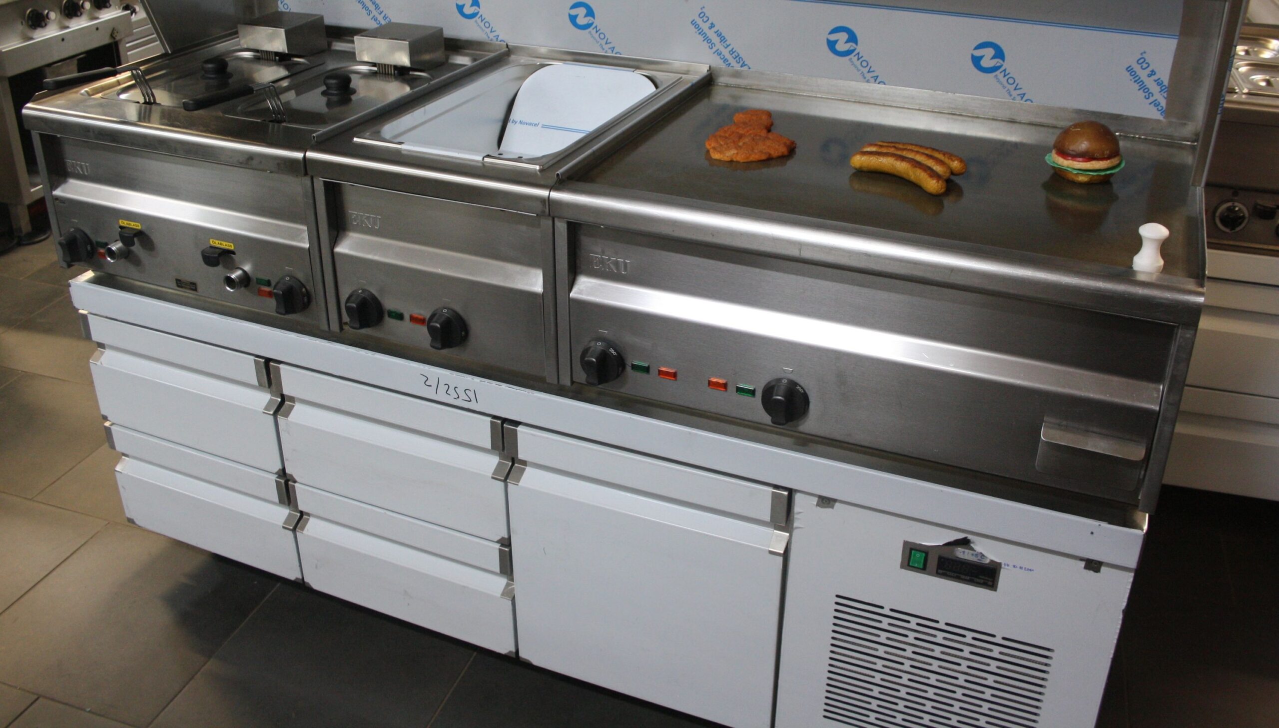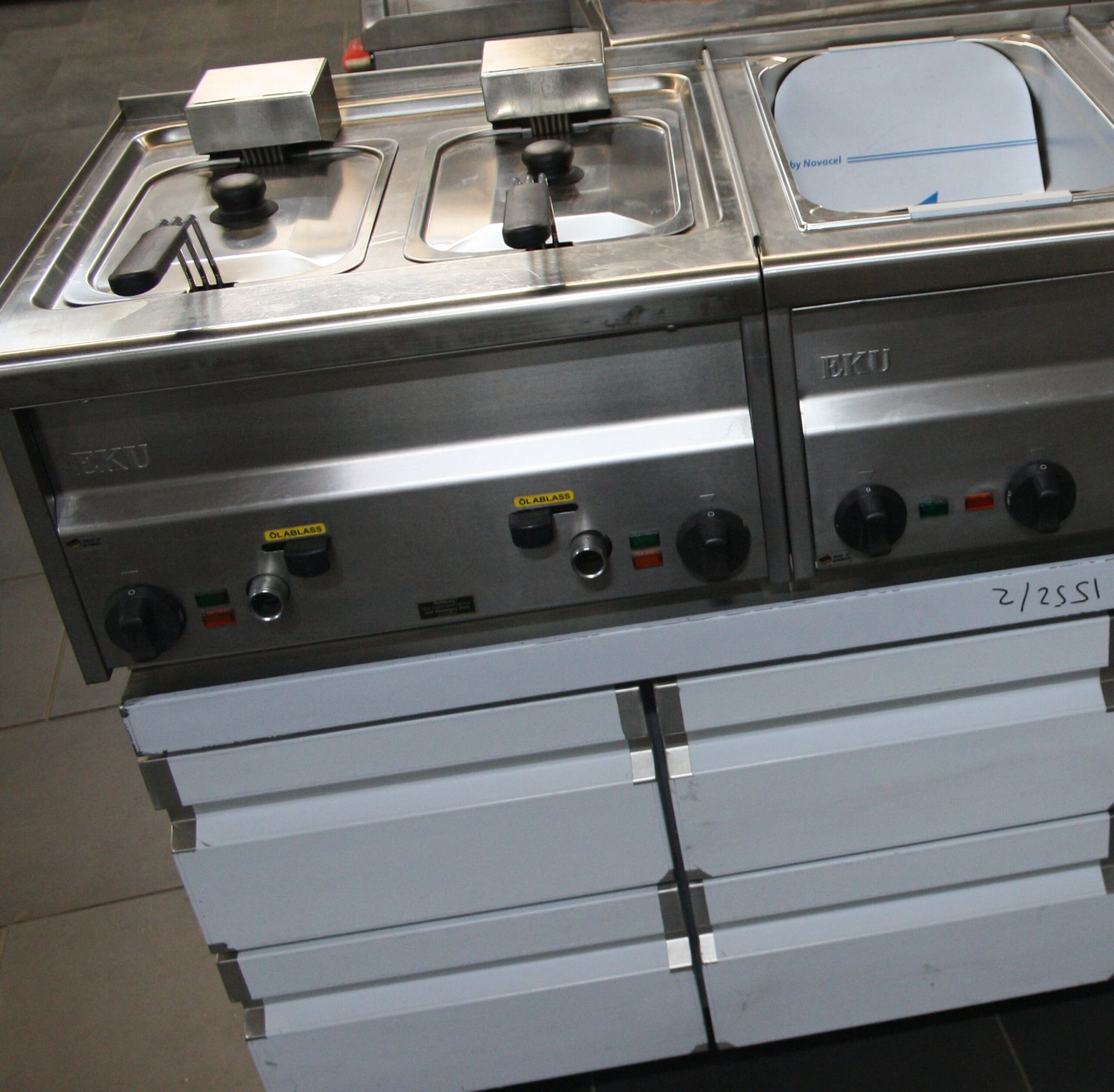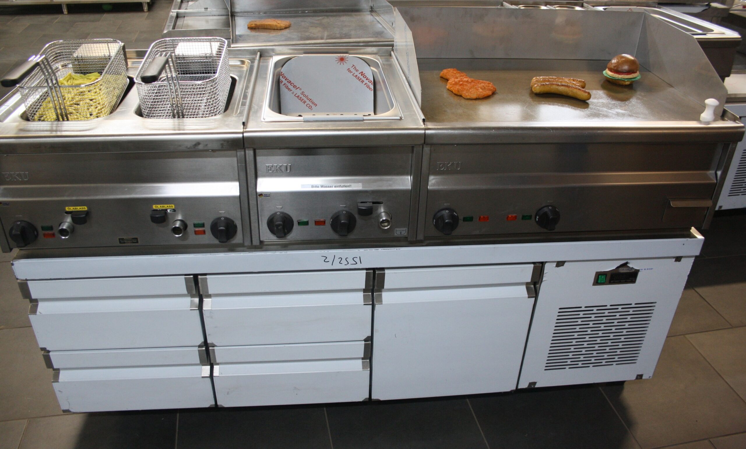 bestehend aus: Fritteuse, Bräter, Bain Marie oder Pommesbecken beheizt, Tischmodul gekühlter Unterschrank (2 x 2 Schubladen +  1Tür )